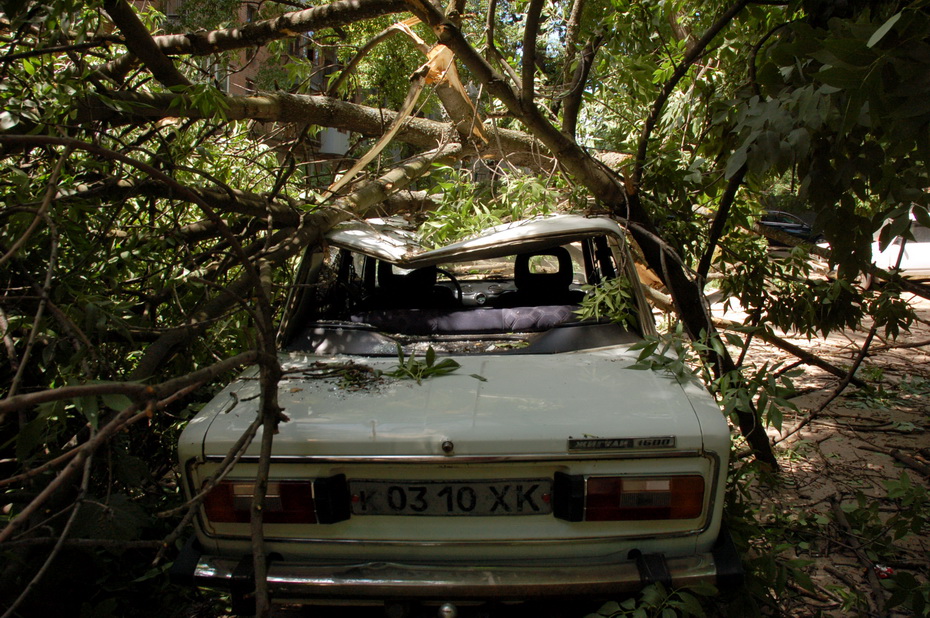 Ветка упала быстро — гнилая была, объясняют жильцы дома. Основной удар пришёлся на белую «шестёрку». Владелец автомобиля, Максим, рассказал, что купил автомобиль около полугода назад, сделал капитальный ремонт. Оценить ущерб «на глаз» сложно, но и под завалами из листьев и веток видно, что кузов машины серьёзно пострадал: прогнулась крыша, боковые стойки, выбиты стёкла.