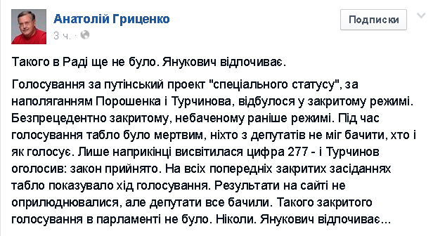 «Когда камеры выключили, популизма стало меньше — под триста голосов «За». Оба тяжёлые законы приняты… Дай Бог, чтобы они сработали. Я не верю, что эти законы будут действовать, но я хочу, чтобы весь мир теперь давил на Россиию с требованием вывести войска и отдать под контроль Украины и ОБСЕ наши границы. Если этого не произойдёт, соответственно, и законы, принятые сегодня, не будут действовать!», — описал свои впечатления в Facebook нардеп Александр Бригинец.