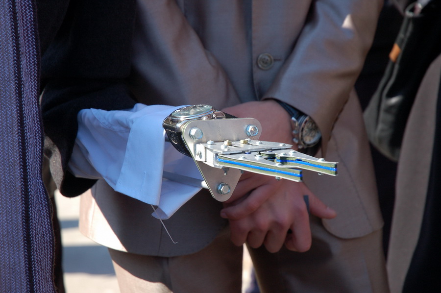 Дживко действительно одет в человеческое: пальто, шляпа, очки. Как внешний вид, так и внутреннее устройство — «из того, что под рукой было», объясняют студенты-создатели. Говорят, этот робот — проба пера. Обещают усовершенствовать.