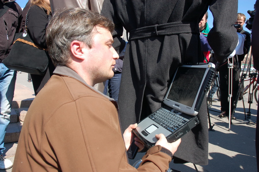 Прохожие при виде робота возле памятника Ленину останавливаются, разглядывают. Некоторые говорят: «Думали, реклама мужской одежды».