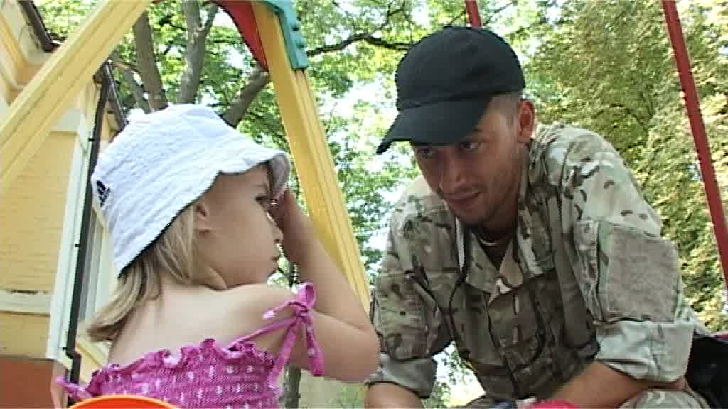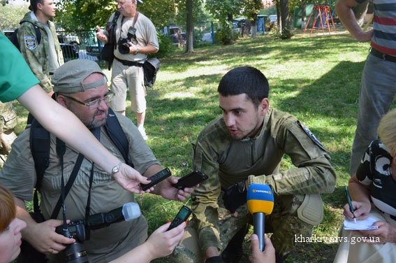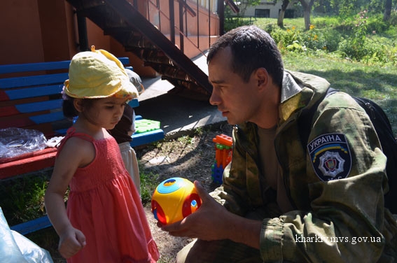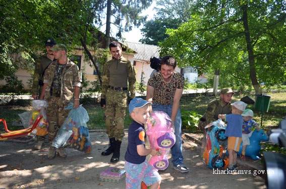 Сегодня сюда приехали бойцы батальона милиции особого назначения «Киев-1». Это подразделение участвовало в освобождении Славянска и Николаевки Донецкой области, ездило патрулировать улицы Одессы после столкновений второго мая. Добровольцы здесь транзитом — после отпуска едут из украинской столицы в Славянск и дальше на передовую. С собой привезли игрушки. Харьковские журналисты могли видеть, как дети растаскивали игрушечные машинки размером с их рост.