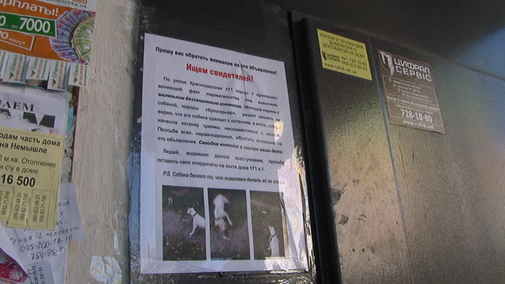 На подъезде 16-этажки, где живёт Маргарита, висит объявление — замаскированное под поиск свидетелей предупреждение («Сегодня котёнок, а завтра ваши дети») с фотографией пса.