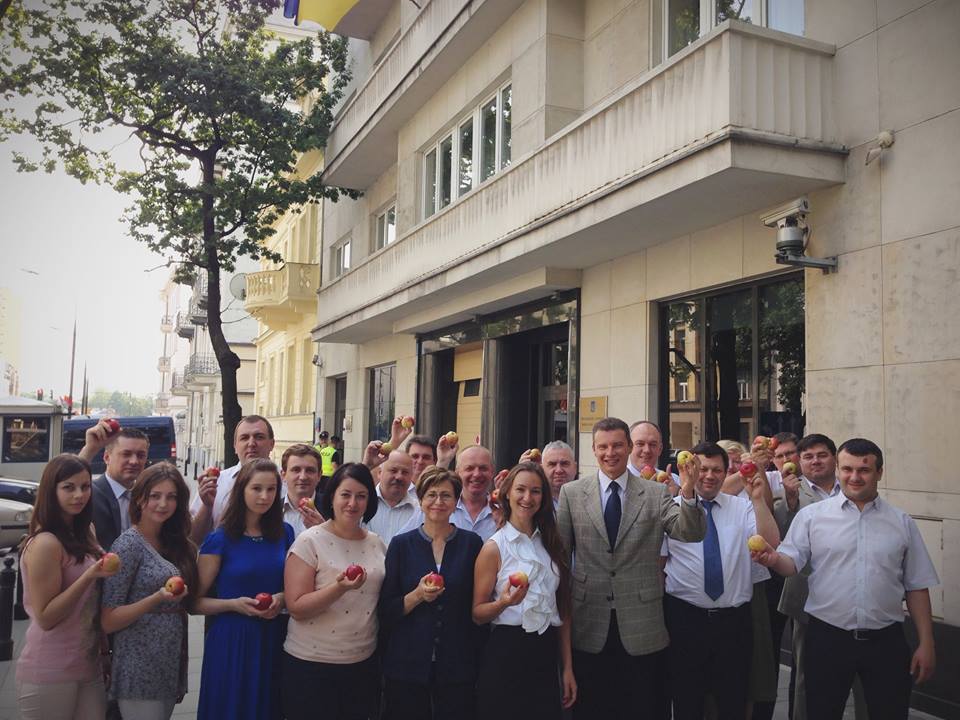 Акцию поддержали и дипломаты посольства Украины в Польше. На официальной странице посольства в Facebook они опубликовали коллективные фотографии с яблоками в руках.