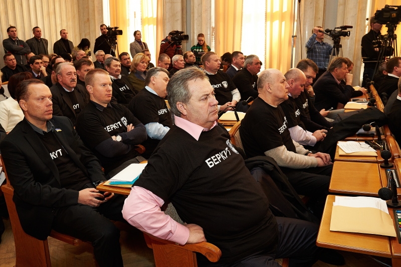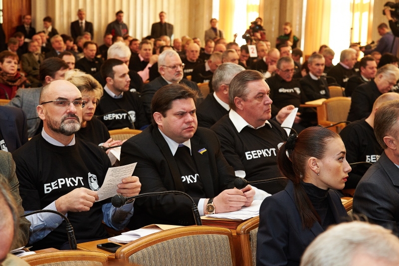 Председатель Харьковской облгосадминистрации Михаил Добкин, глава облсовета Сергей Чернов и депутаты фракции Партии регионов в облсовете пришли на сессию в чёрных футболках с надписью «Беркут» и эмблемой спецподразделения.