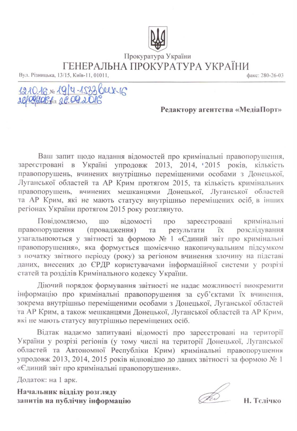 «Действующий порядок формирования отчётности не даёт возможности выделить информацию об уголовных правонарушениях по субъектам их совершения, в частности внутренне перемещёнными лицами из Донецкой и Луганской областей и АР Крым, а также жителями Донецкой, Луганской областей и АР Крым, которые не имеют статуса внутренне перемещённых лиц», — сказано в ответе Генпрокуратуры.