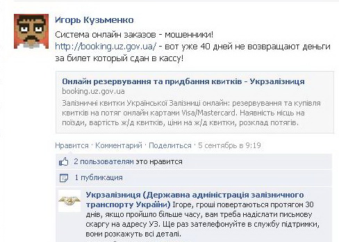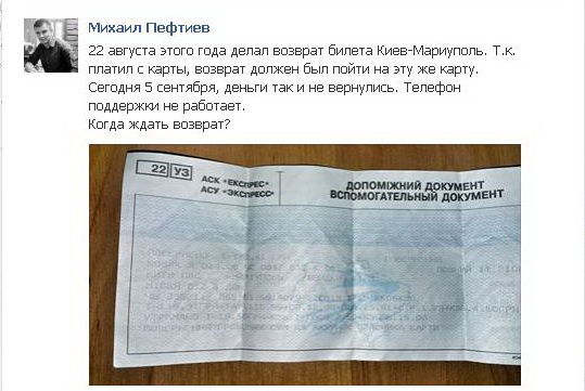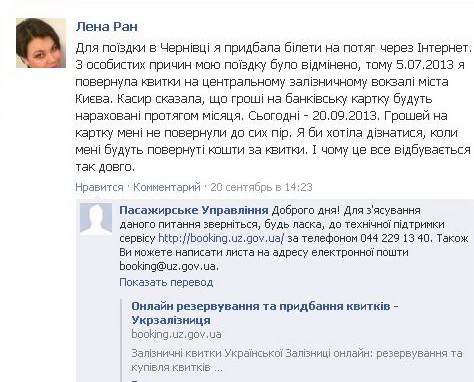 Но, как рассказывают пассажиры, которые сдавали билеты в кассах вокзала, деньги на карточку приходят с опозданиями или не приходят вообще. Жалобы на работу сайта они оставляют на странице «Укрзализныци» в Facebook (на собственном официальном сайте предприятия возможности комментировать новости или оставлять жалобы нет).
