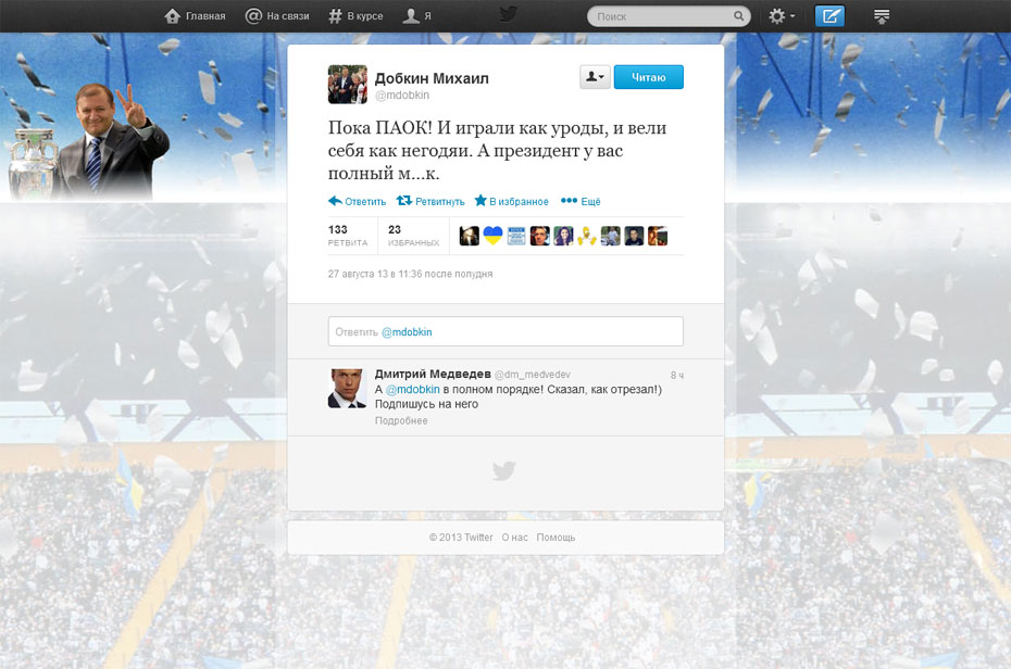После проигрыша ПАОКа «Шальке» префект Харькова Майкл Добкин написал следующий комментарий на Twitter: «Пока ПАОК! И играли как уроды, и вели себя как негодяи. А президент у вас полный м…к».
