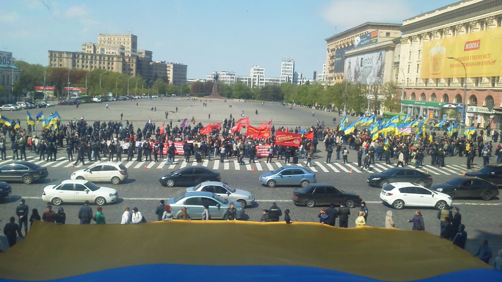 Кордоны милиции, красные флаги и украинская символика. С утра на площади Свободы собираются протестующие.