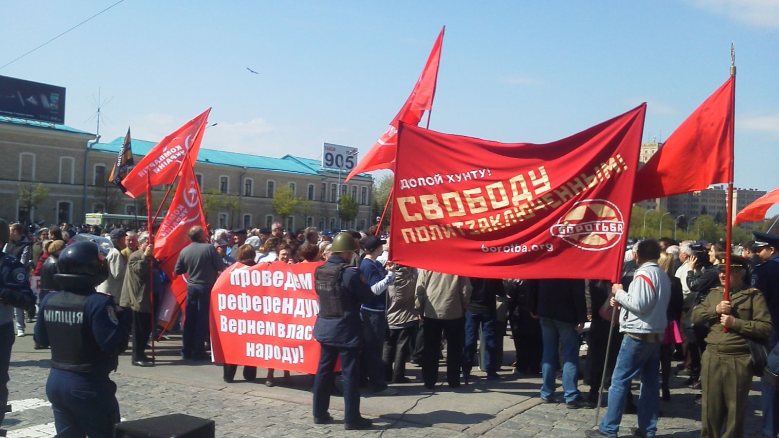 В одной группе с людьми с георгиевскими лентами — коммунисты. Они занимают место по центру. Лозунги — стандартные: «Да — референдуму», «Нет — фашизму», «НАТО — террористическая организация», «Свободу политзаключённым».