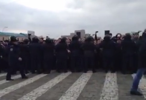 В итоге нападавшие заставляют стать этого человека на колени. Милиция пытается его оборонять, но у неё это плохо выходит. Поднимать человека с колен милиционеры не спешат. Он получит ещё несколько подзатыльников и ударов.