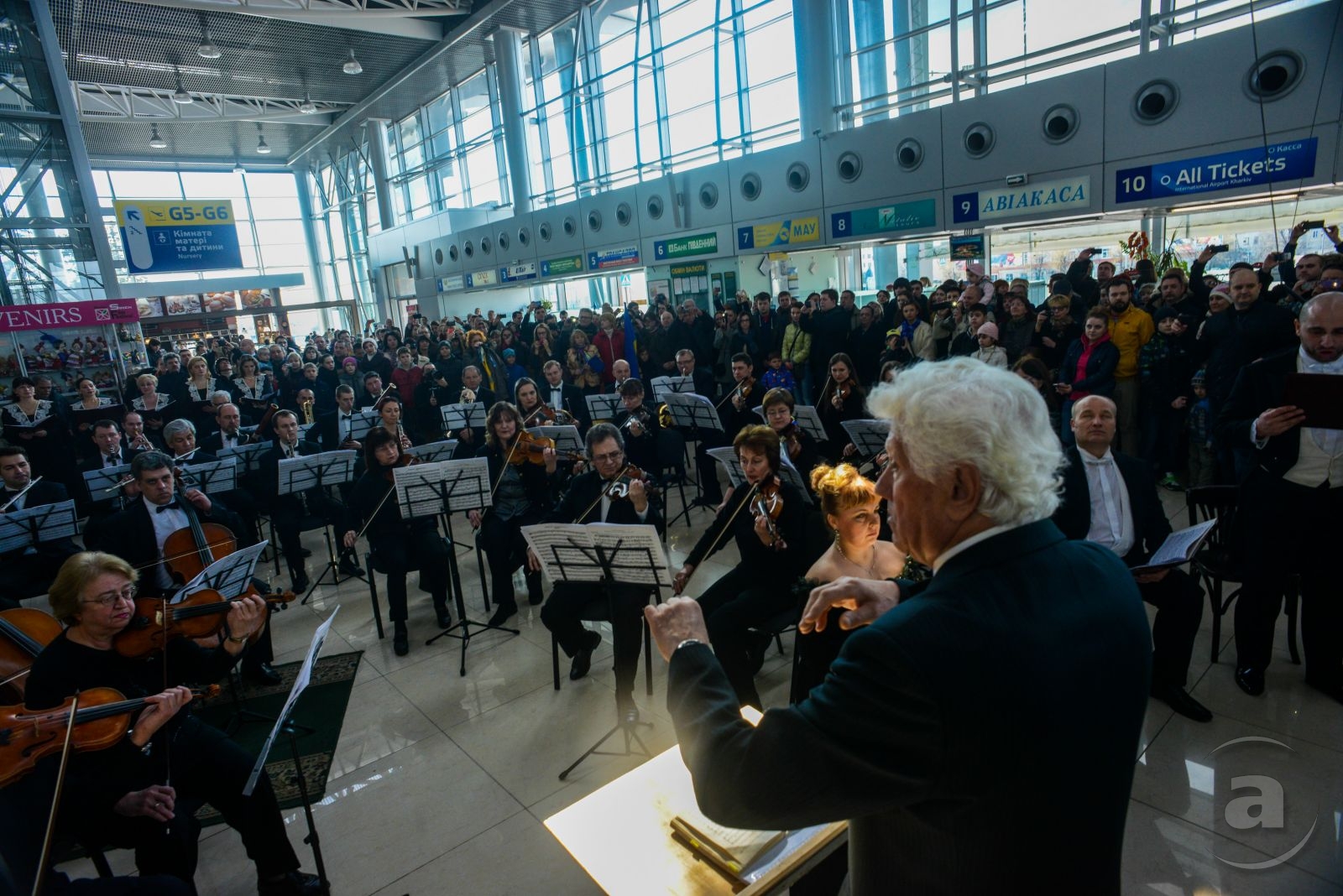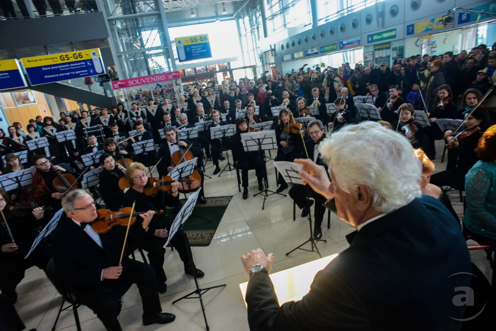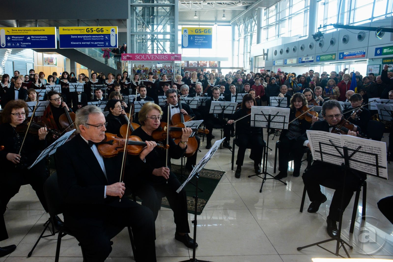 В Международном аэропорту Харьков «Оду к радости» исполняет симфонический оркестр и хор Харьковского национального академического театра оперы и балета.