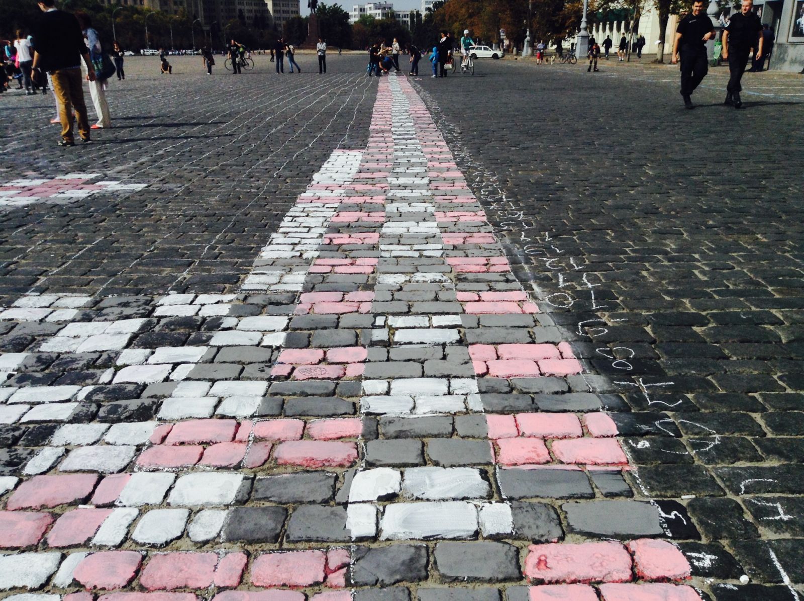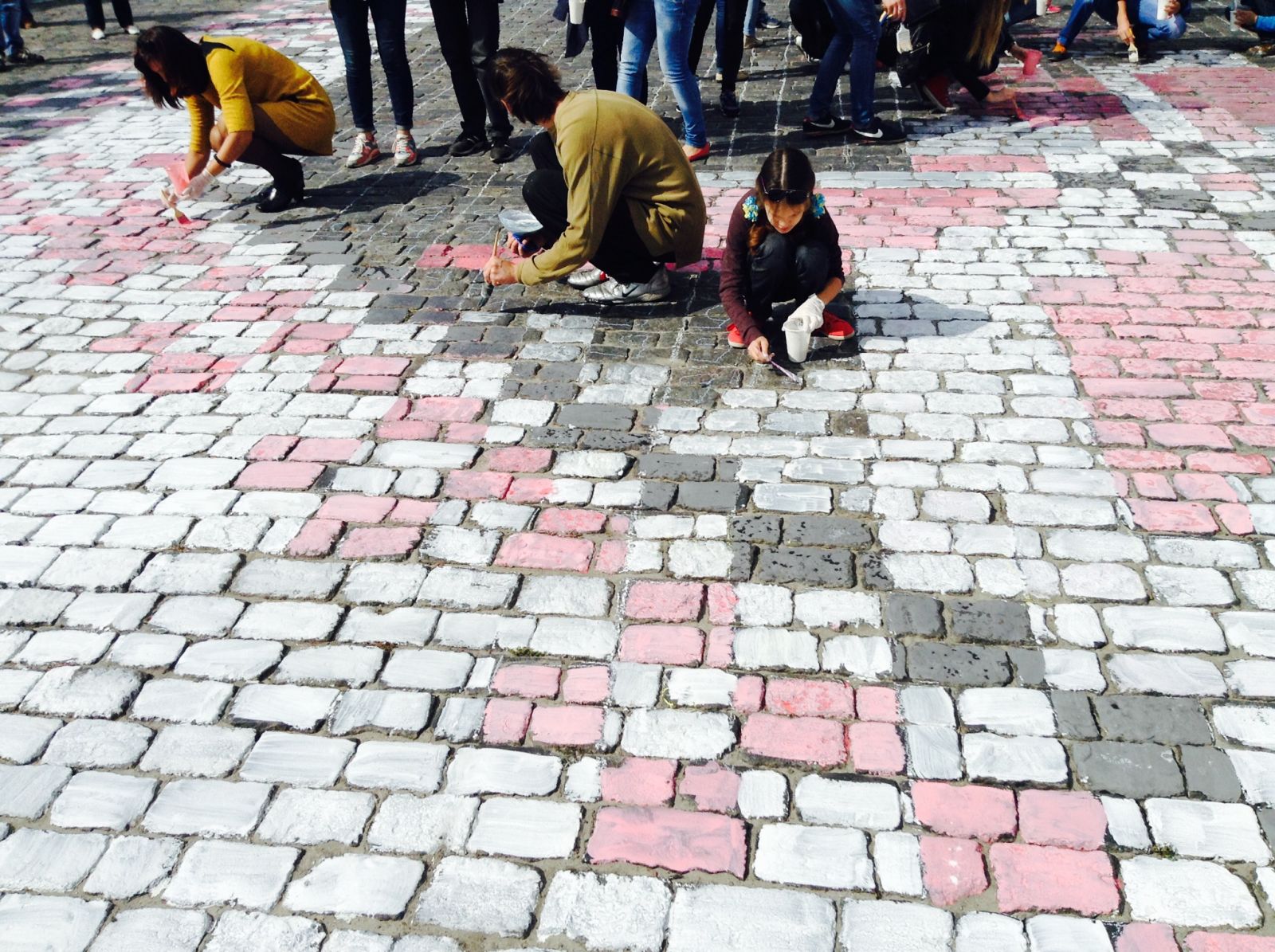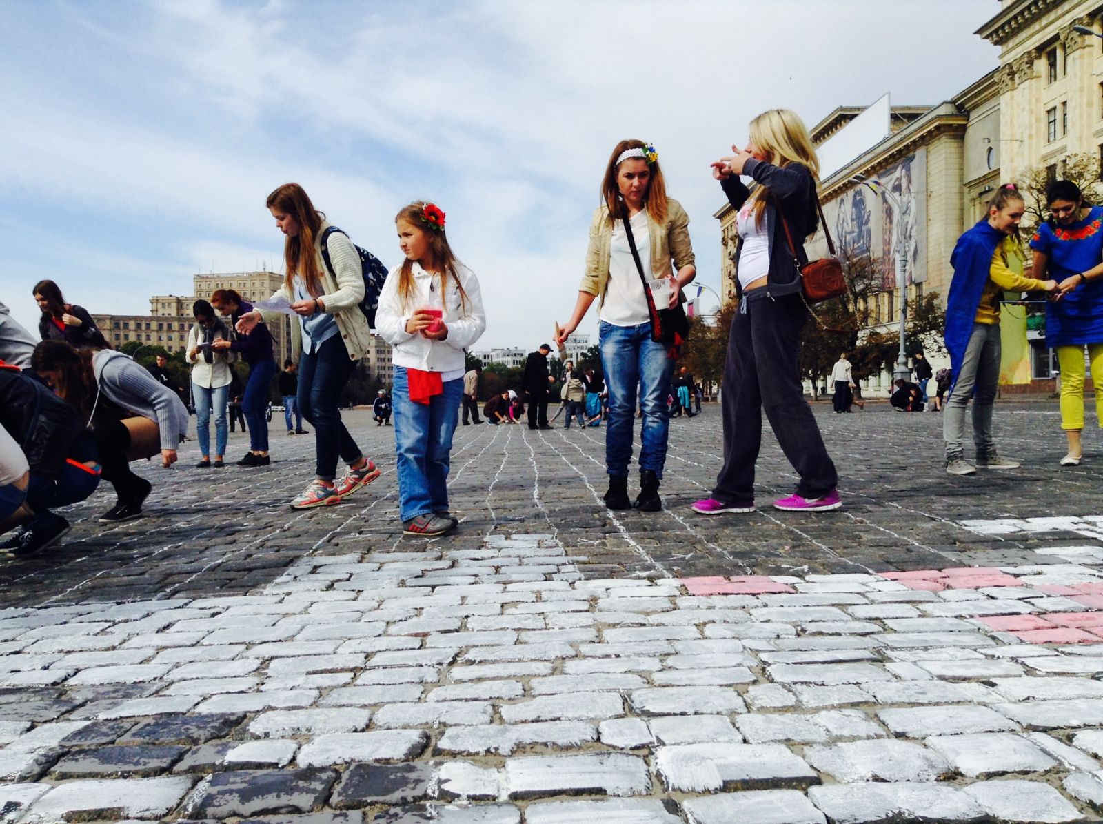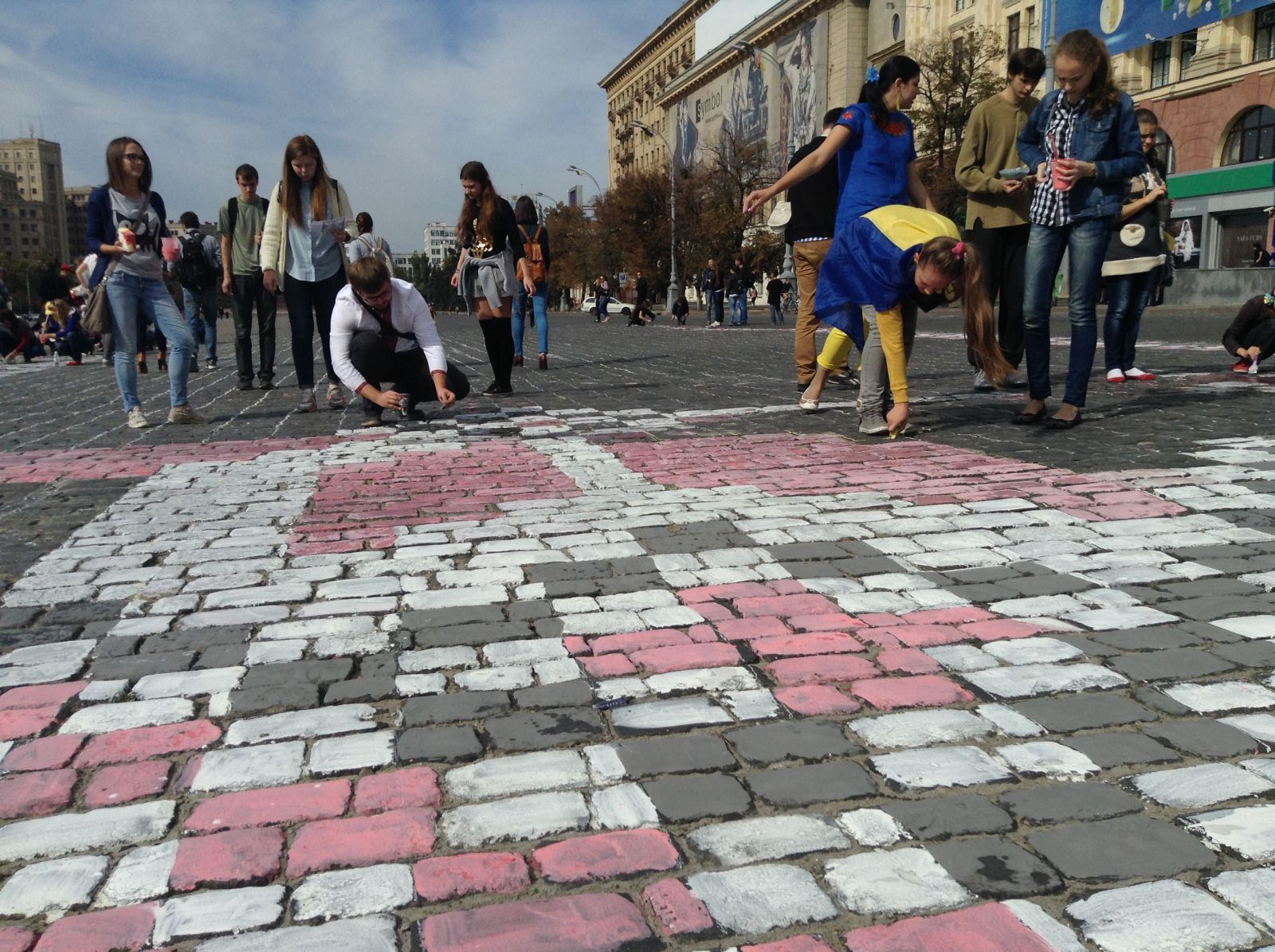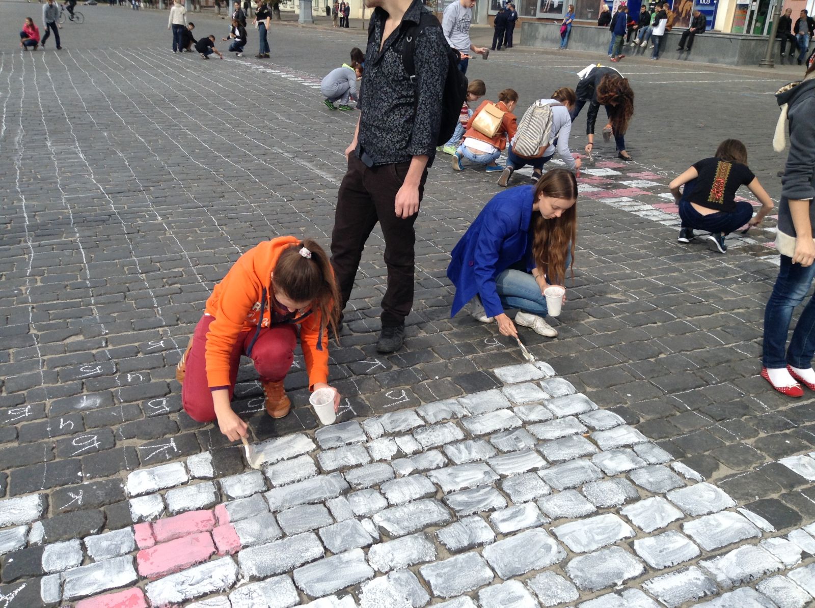 Больше семи часов жители города разукрашивали брусчатку на площади Свободы орнаментом. К вечеру узор достиг сотни метров.