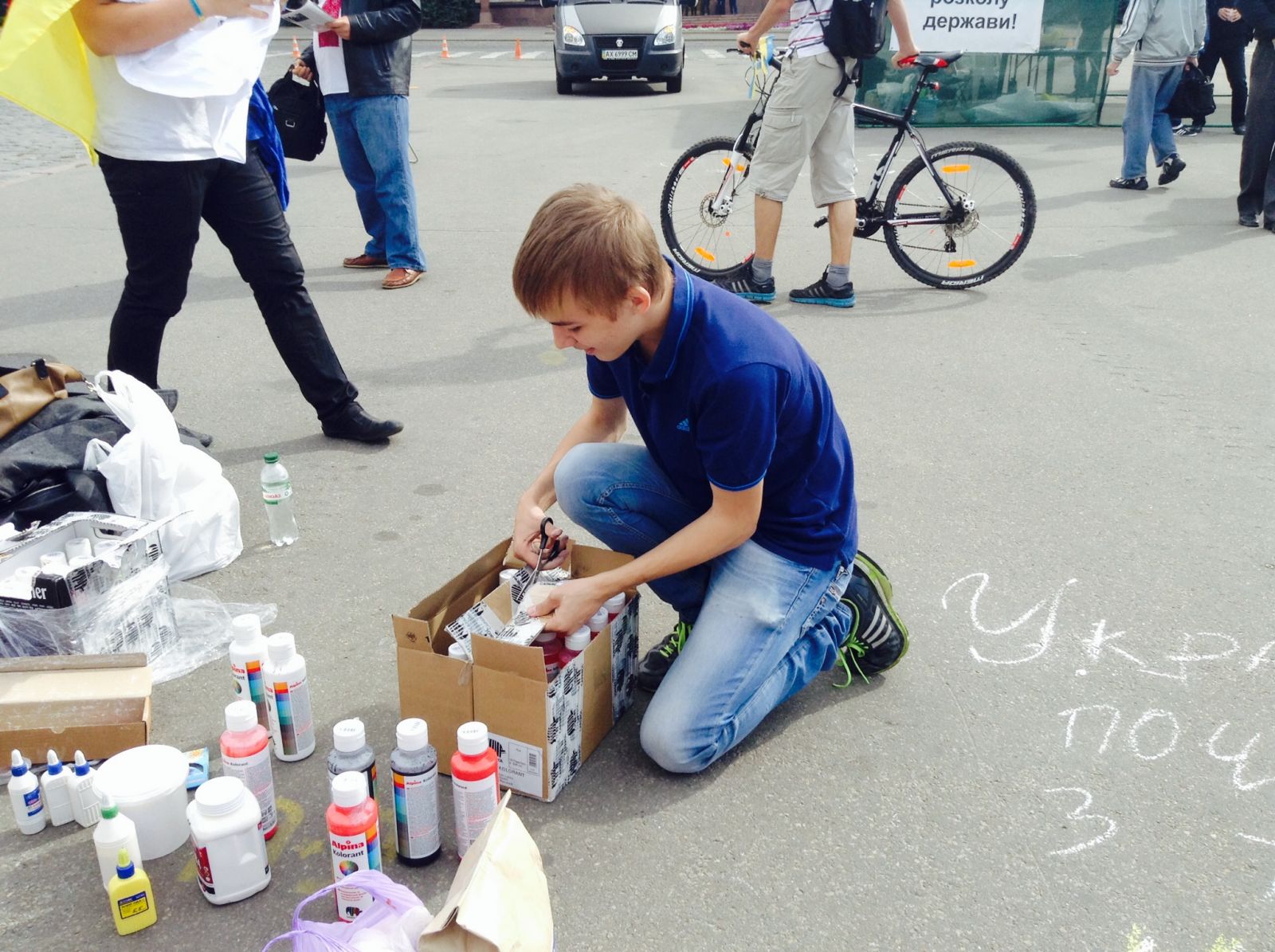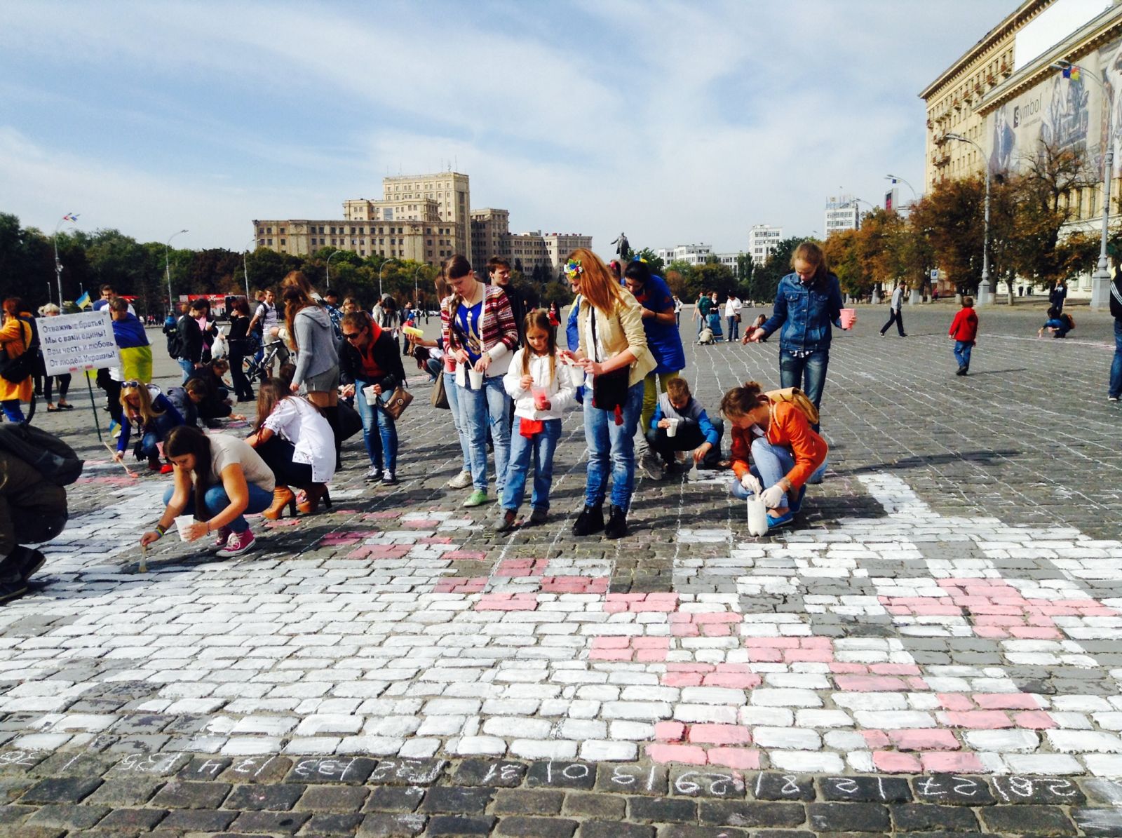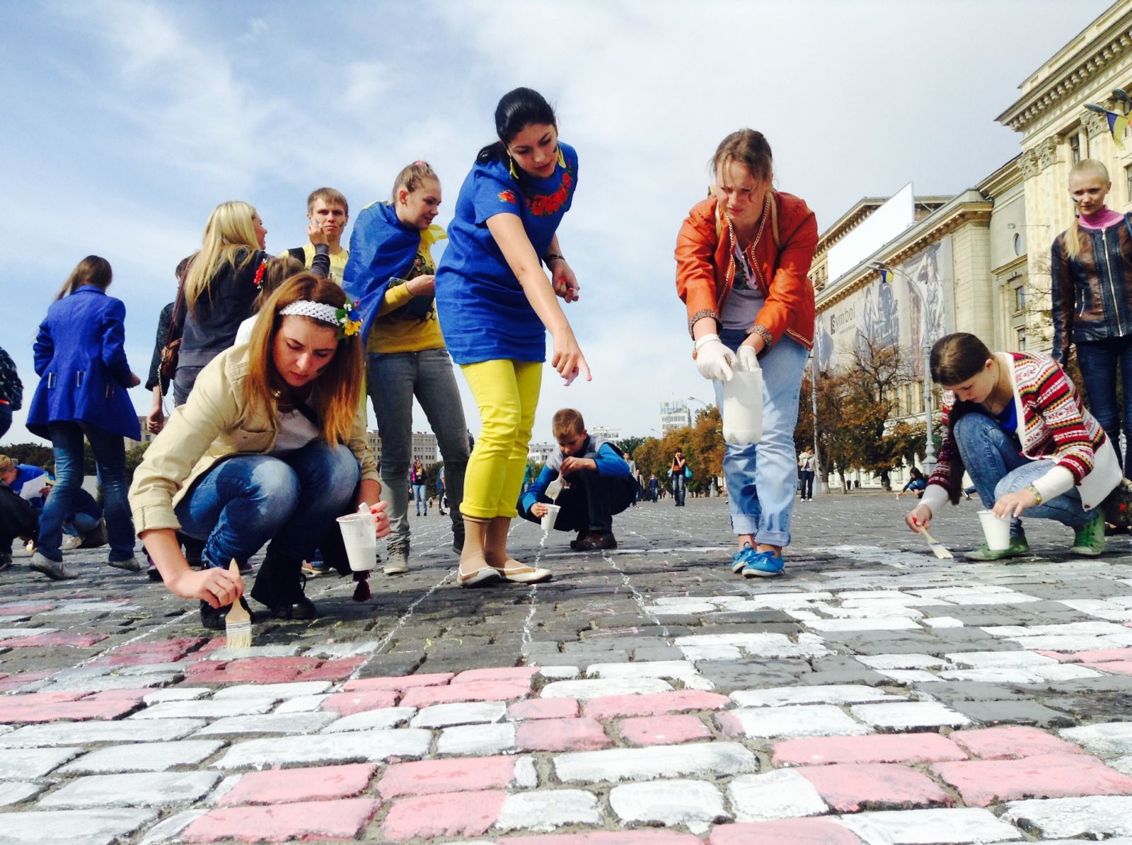 Нарисованная на брусчатке вышиванка длиной сто метров для Украины — рекорд, утверждает один из организаторов акции Евгений Бондаренко.