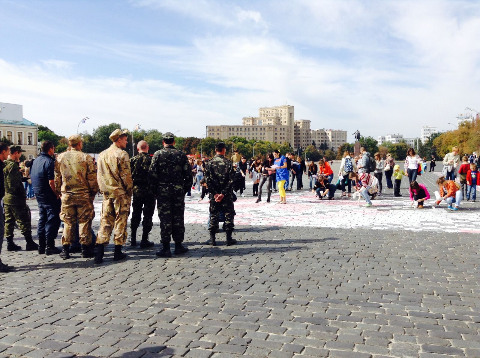 «В этом году мы побили рекорд Луганска (в 2012 году луганчане нарисовали 45-метровую вышиванку — ред.), решили сделать это символично в День мира. Сейчас наша страна переживает очень сложные времена, нужно сплачивать народ, людей этого государства. И это одна из основных целей», — объясняет Евгений.