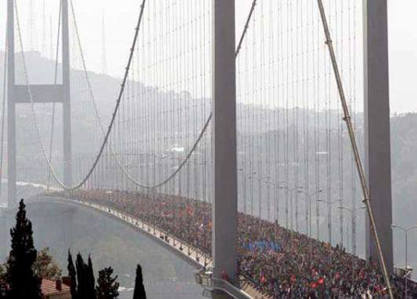 В субботу беспорядки в Стамбуле возобновились. Большая группа протестующих перешла по мосту Ататюрка, движение пешеходов по которому запрещено, с азиатского берега на европейский для помощи демонстрантам на площади Таксим.