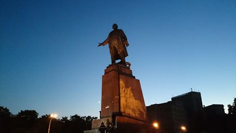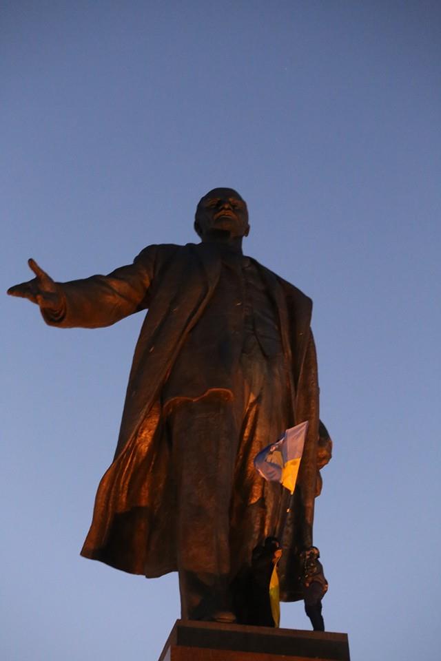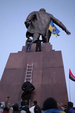 Около сотни человек под украинскими флагами, флагами «Правого сектора», а также с символикой добровольческого батальона «Азов» проводят акцию возле памятника Ленину на площади Свободы. На постаменте с помощью перфоратора участники акции высекают фразу «Слава Украине». Милиции возле памятника нет.