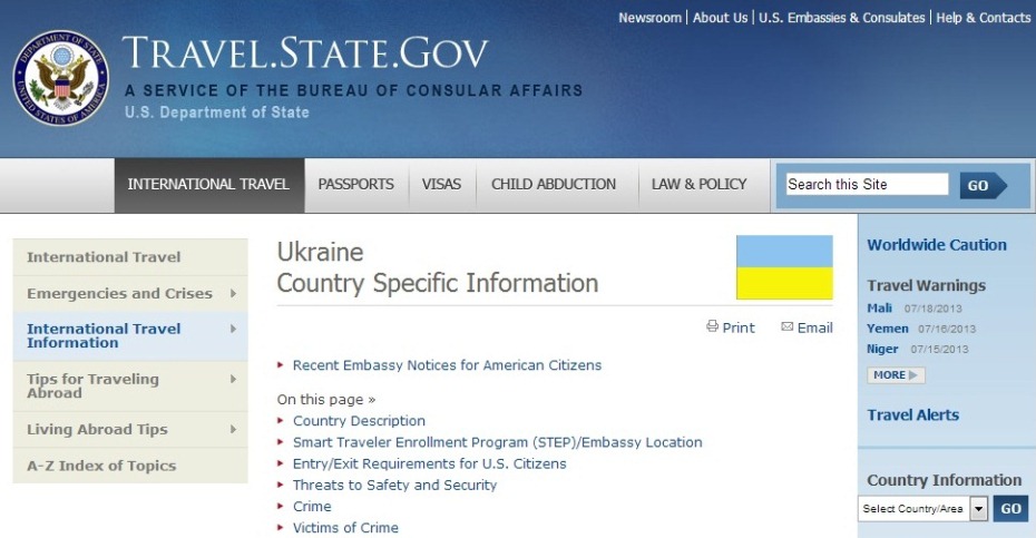 Примечания переводчика: здесь не всё — пропущен официоз с адресами Посольства и его подразделений и некоторые абзацы, касающиеся в большей степени Америки, чем Украины (страховки, паспорта, перелёты и т.д.); также остались вне перевода заботливые разъяснения Бюро, что в Украине говорят не ATM, а «bankomat», как позвонить в скорую и другие трогательные мелочи. И ещё — вполне возможно, что при перепеве была утеряна всякая политкорректность. Информация об Украине на сайте Бюро последний раз обновлялась 31 января 2013 года.
