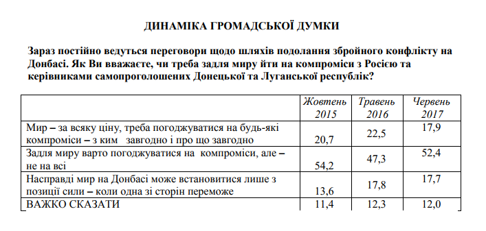 «Готовность к компромиссам снижается с увеличением отдалённости от военных действий. Так, готовность идти на любые компромиссы ради мира демонстрирует каждый четвёртый респондент на Востоке, а на Западе Украины только каждый десятый», — сказано в исследовании.