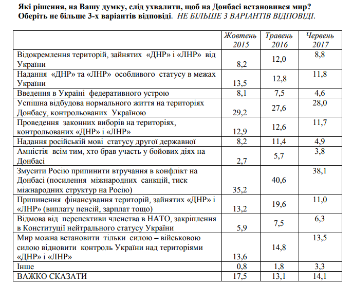 Наиболее действенными решениями для достижения мира большинство опрошенных считают международное давление на Россию, чтобы она отказалась вмешательства в конфликт на Донбассе (38%), и успешное восстановление нормальной жизни на подконтрольной территории Донбасса (28%). Количество людей, которые считают, что для установления мира нужно прекратить финансирование этих территорий, по сравнению с опросом прошлого года уменьшилось (с 20% до 11%). Также уменьшилось количество тех, кто ради достижения мира настаивал на признании русского языка вторым государственным (с 11% до 5%) и изменении формы государственного устройства в стране на федеративную (с 7,5% до 5%).