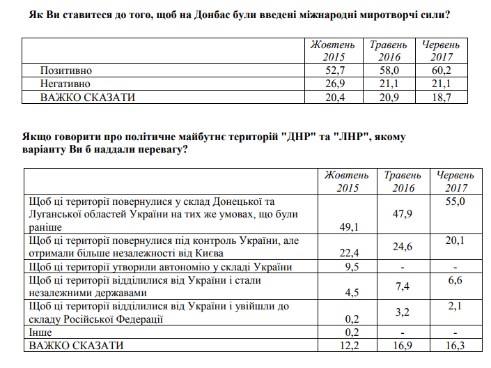 Большинство украинцев (55%) видят неподконтрольные территории на Донбассе в составе Украины на довоенных условиях. Каждый пятый склоняется к возможности предоставления большего уровня автономии этим территориям в составе Украины, около 9% поддержали самостоятельное существование самопровозглашённых образований или присоединение их к России. Больше всего выступающих за автономные права «ДНР» и «ЛНР» — в восточной части Украины (28%), однако это всё равно меньшинство, 47% видит захваченные территории в составе Украины на довоенных условиях.