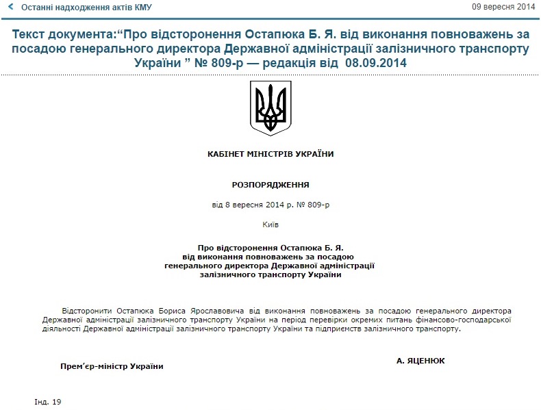 На время проверки гендиректор «Укрзалізниці» Борис Остапюк отстранён от исполнения обязанностей. Соответствующие распоряжение опубликовано на Правительственном портале.