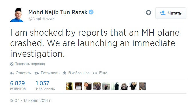 UPD 19.13 Премьер-министр Малайзии Наджиб Тун Разак шокирован произошедшим и заявляет о немедленном начале своего расследования.