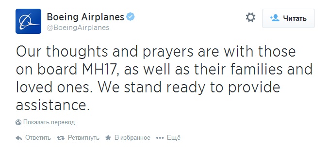 «Наши мысли и молитвы с теми, кто на борту MH17, а также с их семьями и близкими. Мы готовы оказать помощь», — говорится в сообщении компании.