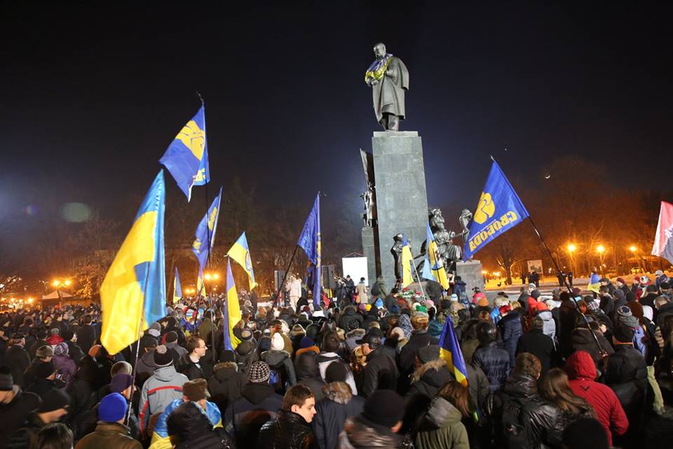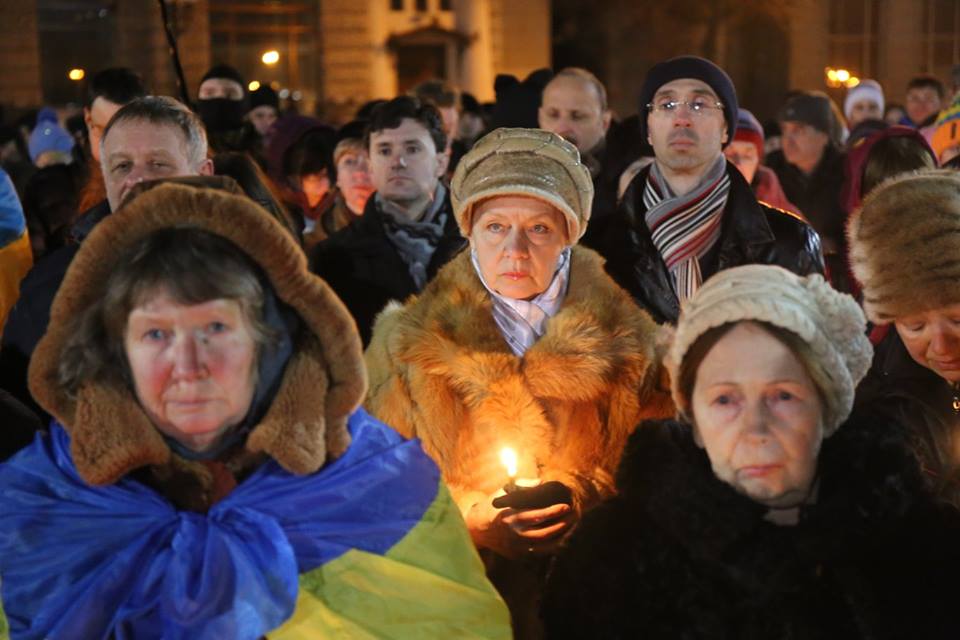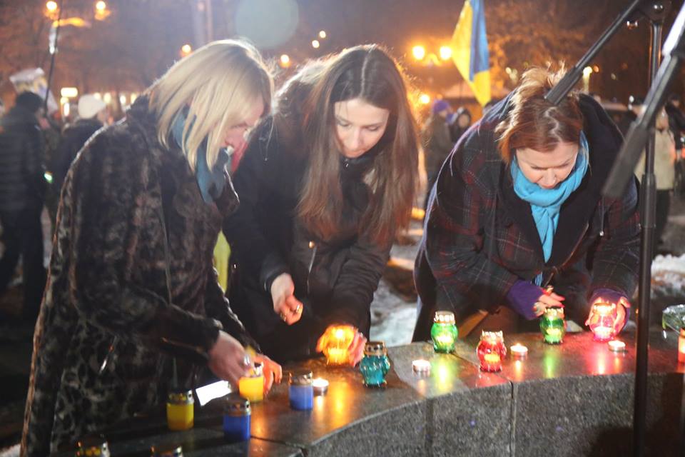 Несколько сотен людей с украинскими флагами пришли к памятнику Шевченко с цветами и лампадами. В храмах Харькова прошёл молебен по погибшим на Майдане.