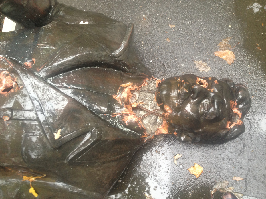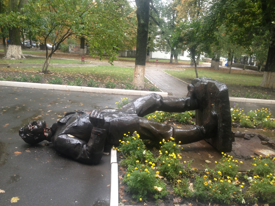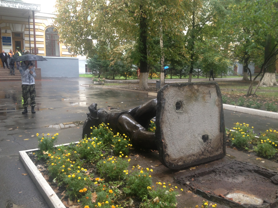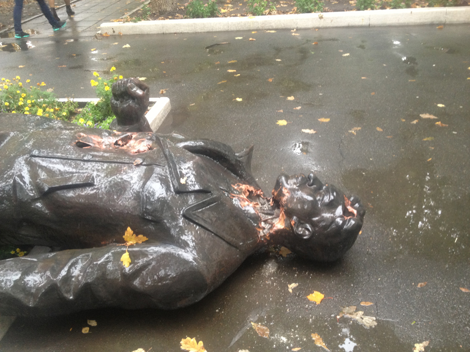 Металлическую скульптуру свалили с невысокого постамента и повредили ей шею и голову. Всё это происходило в трёхстах метрах от Киевского районного отделения милиции.