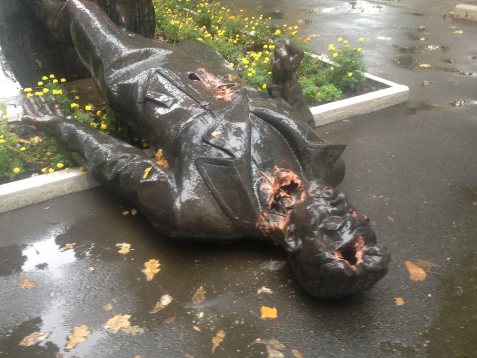 Фотографию лежащей на земле скульптуры опубликовали пользователи социальных сетей.