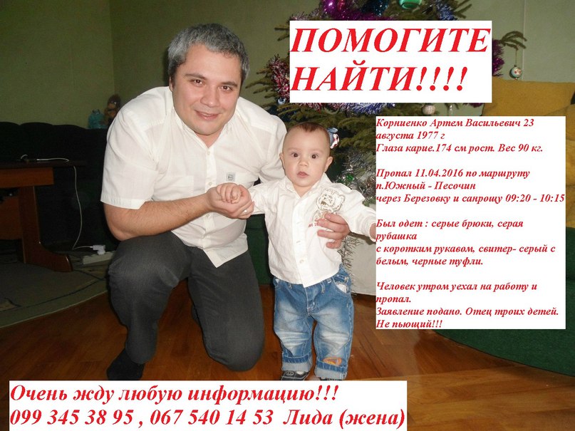 «Машина найдена в 30 метрах от заправки в Старом Салтове. Стояла по направлению в Харьков. Артёма видели 2 свидетеля (их уже допросили). Последний раз видели в Волчанских Хуторах, в 7:20 утра, во вторник 12.04.2016. Из личных вещей, которые были изъяты из авто, отсутствуют только деньги и паспорт. Банковские карты, документы, телефоны, сумка, ключи от авто-всё на месте. Артёма телефон был отключен, вынута батарея […] Обе карточки (SIM-карты — ред.) есть, одна была непосредственно в телефоне, а вторая была почему-то вытащена, но лежала в сумке. Машина была без топлива. Границу Артём не пересекал ни на легальных пунктах, ни тайком», — написала супруга Артёма Лидия Корниенко в соцсетях и на «ХарьковФоруме».