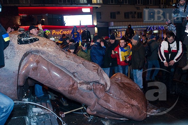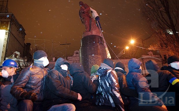 На официальном сайте МВД отмечается, что в сносе Ленина участвовала «группа неизвестных лиц в масках с флагами ВО «Свобода».