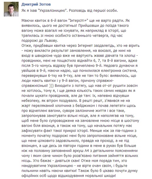Как такое возможно, «МедиаПорт» попросил объяснить представителя ГП «Украинская железнодорожная скоростная компания» Александра Красноштана. О письме Зотова в Facebook он знает, однако считает, что в такой ситуации «нет ничего страшного».