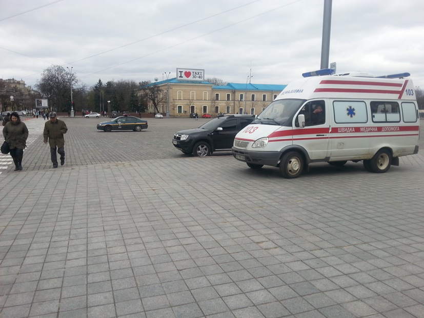 Автомобили МЧС и скорой, которые в последнее время постоянно дежурят неподалёку от площади Свободы, переместились ближе ко входу в обладминистрацию.