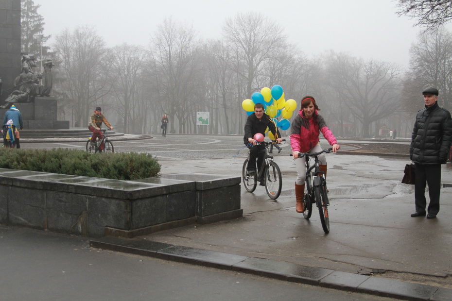 Пара, которая познакомилась на харьковском Евромайдане, сегодня сыграла свадьбу. Перед бракосочетанием будущие молодожёны проехались по центру города в сопровождении сорока велосипедистов.