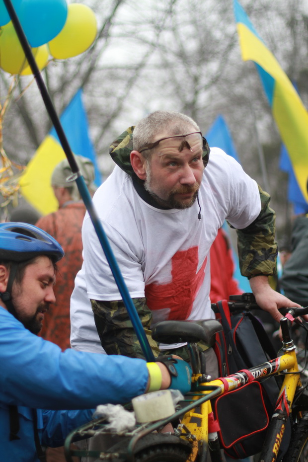 Харьковский ВелоМайдан собрался в полдень у памятника Тарасу Шевченко. За несколько минут до старта велосипедисты проверяют транспорт и технику — камеры, музыкальные колонки. Почти у каждого — украинские флаги, ленточки или одежда с национальной символикой.