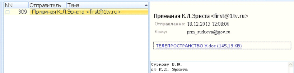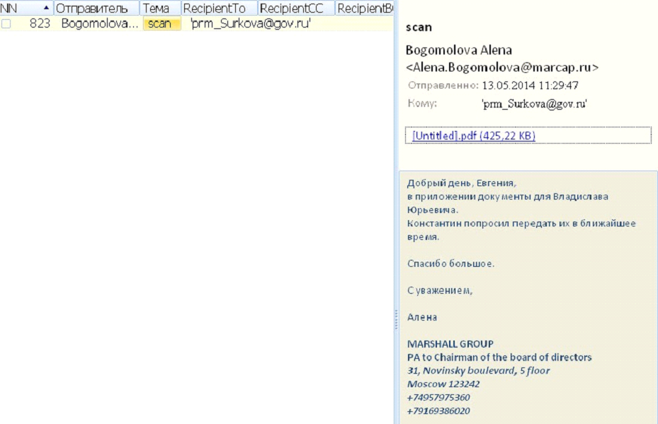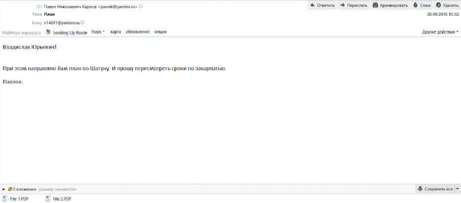 К обоим документам есть вопросы. Наиболее очевидный из них — нестыковка со временем: на скриншоте письма, якобы полученном Сурковым от помощника, значится 23 октября 15:32, тогда как PDF-файлы были созданы позже — в 17:48 и 18:02. Кроме того, документы представляют собой скан-копию, а «конспиратор» Павел Николаевич Карпов, в конце письма подписывающийся как Павлов, «забывает» скрыть своё настоящее имя в адресной строке. Да и использование почтового ящика на «Яндексе» едва ли свойственно для опытного политика Суркова.