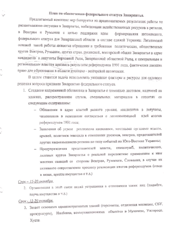 Второй документ, также якобы найденный в переписке Суркова, — план по федерализации Закарпатья, направленный на продвижение идеи федерального статуса региона. Для этого предлагается активизировать русинскую общину Закарпатья, провести съезды и агитацию через СМИ, захватить админздания, а также «втянуть Венгрию в проблемы Закарпатья в интересах российской стороны».