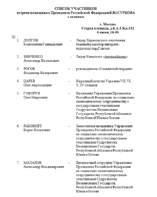 В списке приглашённых на встречи с участием Суркова — один из «рупоров «ДНР» Константин Долгов и «спикер «парламента «Новороссии» Олег Царев.
