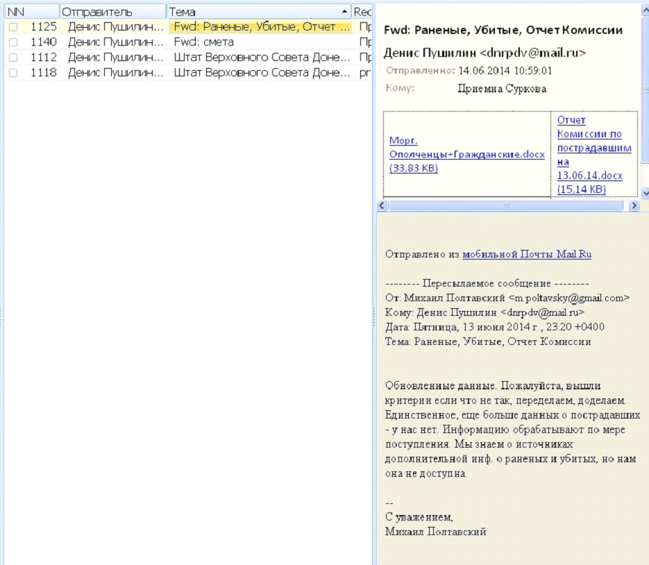 В ящике советника Путина также содержится несколько писем, где отправителем значится один из лидеров самопровозглашённой «ДНР» Денис Пушилин.