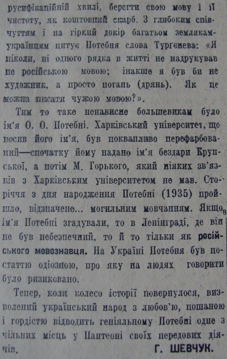 Шевчук Г. «Визначний український діяч. До роковин смерти О. Потебні († 11-ХІІ 1891 р.)». 25–26 декабря 1941 года, №13