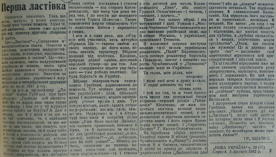 Шевчук Гр. «Перша ластівка». 4 февраля 1942, №20