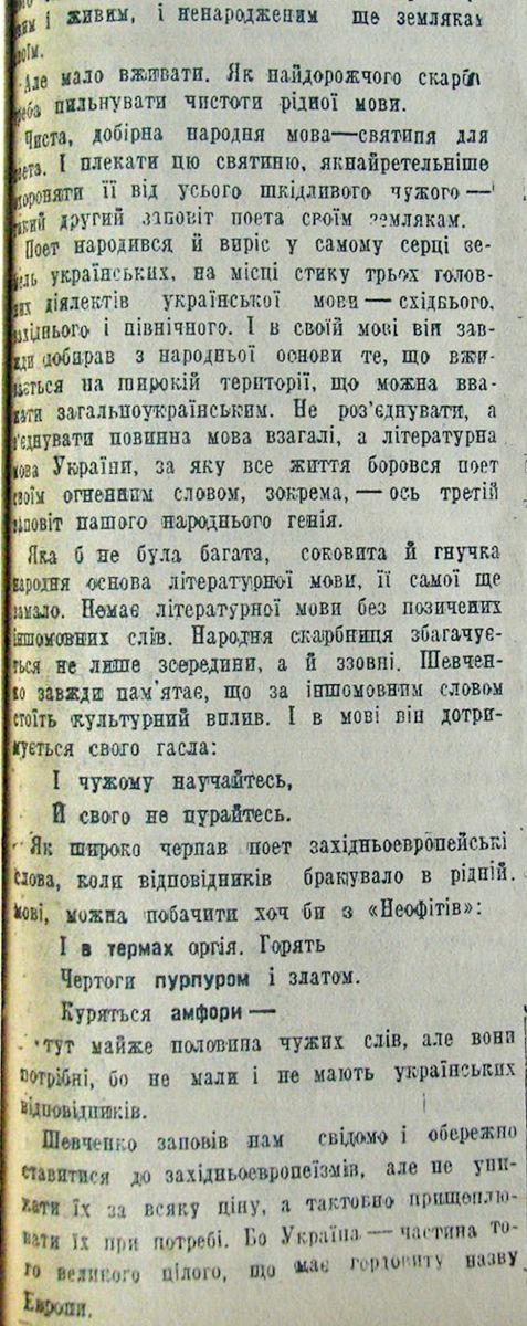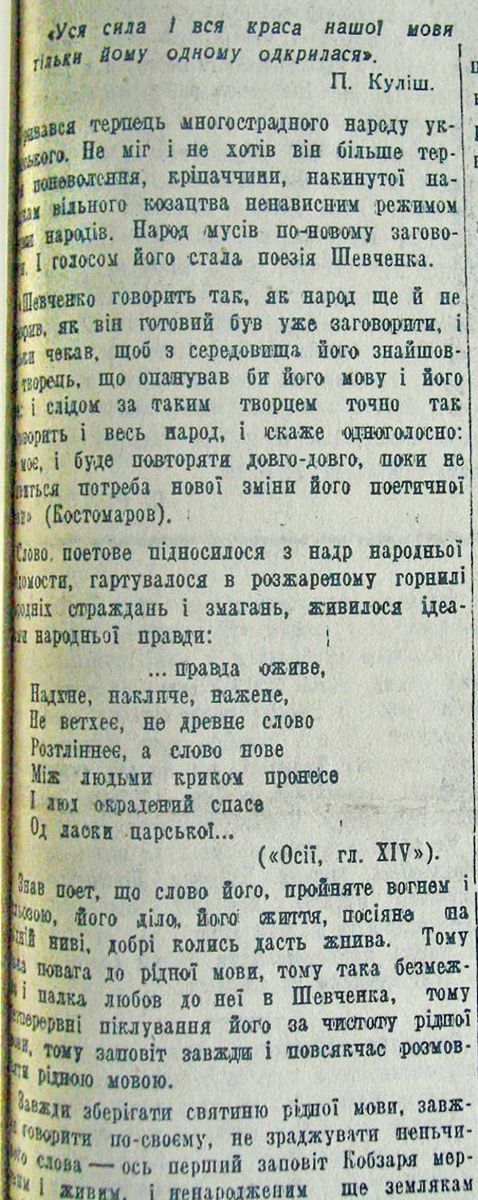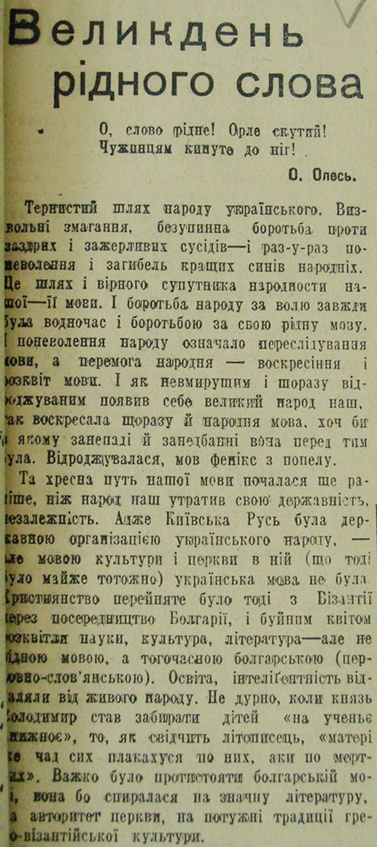 Шевельов Юрій. «Великдень рідного слова». 5 апреля 1942, №70. Эта статья Шевелёва приводится здесь без последнего абзаца из-за некорректной вёрстки номера газеты