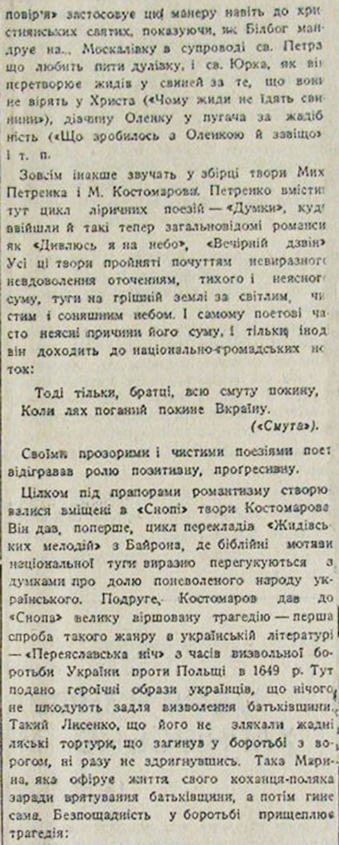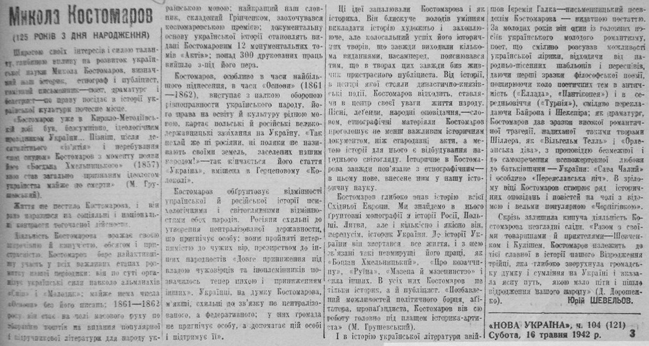 Шевельов Юрій «Микола Костомаров (125 років з дня народження)». 16 мая 1942, №104