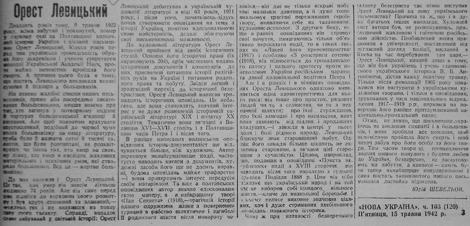 И ещё несколько слов о самой газете «Нова Україна». Выходила она в Харькове под контролем оккупационных властей в 1941-1943 годах. Первый номер появился 7 декабря 1941-го. Вот что сам Юрий Шевелёв вспоминает о ней в мемуарах: