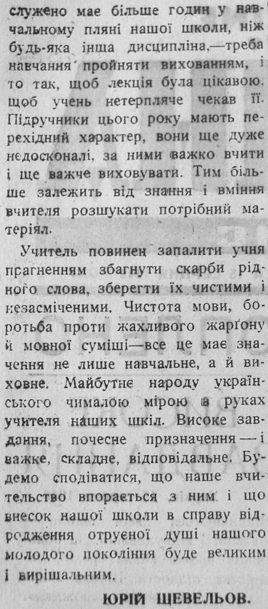 В день 105-летия со дня рождения Юрия Шевелёва «МедиаПорт» публикует все статьи, напечатанные им в «Новій Україні». Всего их было двадцать, они вышли либо под собственным именем автора, либо под псевдонимами Г. Шевчук, Гр. Шевчук, Гр. Шевельов.