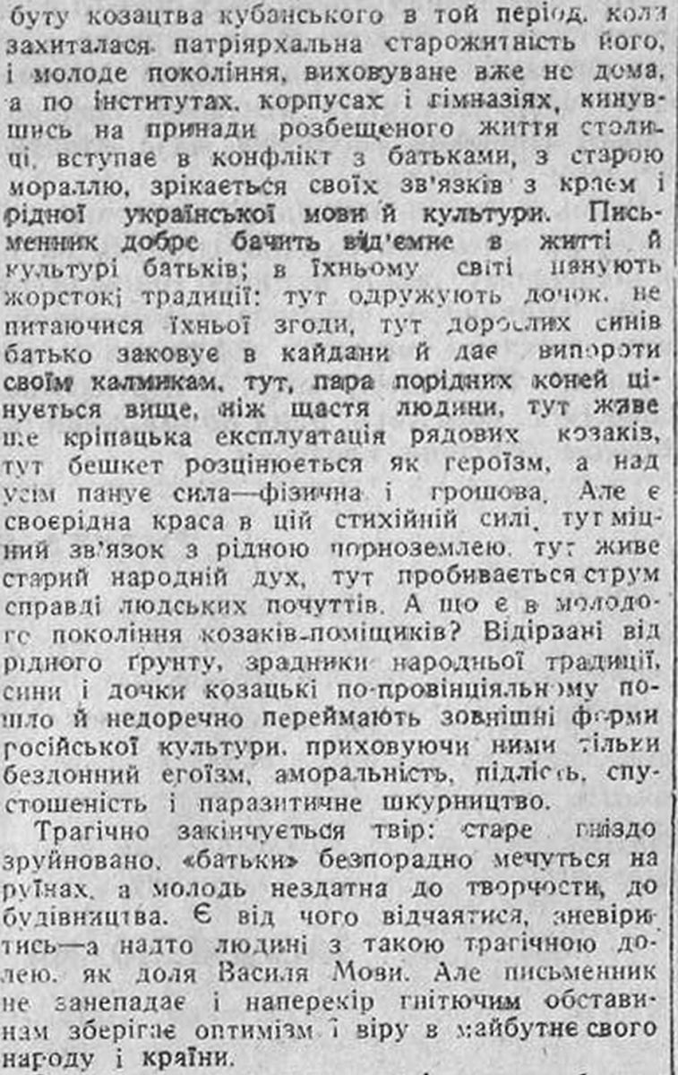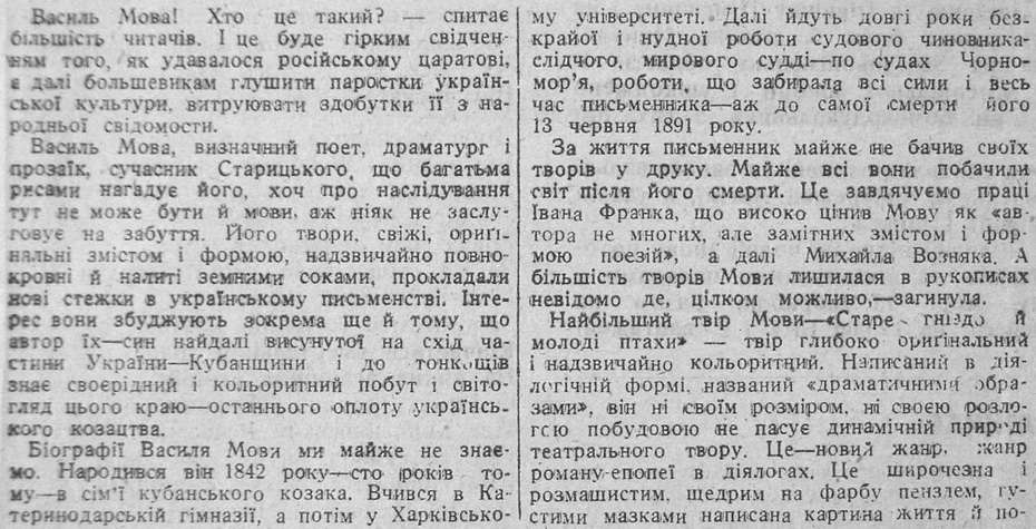 Шевельов Ю. «Поет Кубані (Сто років з дня народження Василя Мови-Лиманського)». 19 августа 1942, №184