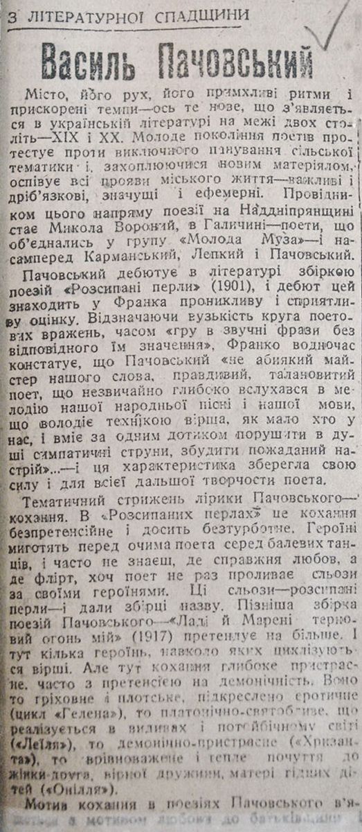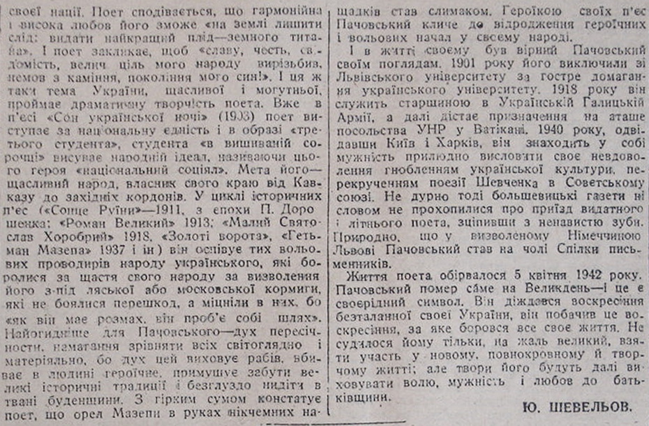 Шевельов Ю. «Василь Пачовський (З літературної спадщини)». 28 января 1943, №21