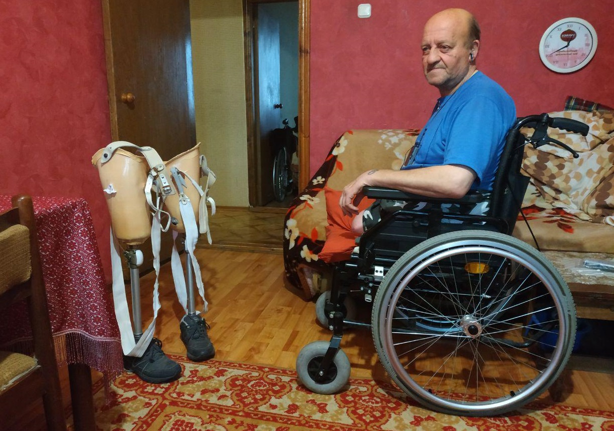 Юрій Горковенко взимку на вулиці майже не буває. У сніг чи ожеледь йому складно пересуватися в інвалідному візку. «Коли в цьому році мені відрізали другу ногу, зробили на протез знижку у 2000 гривень, як «оптовику», — жартує Юрій. — А ось дивіться, які протези. Відразу став вищим на 11 см. Тільки в них неможливо ні сісти, ні встати. Використовую як сушку для рушників. Дуже зручно. А до протезів ще й взуття дали. Дві пари — зимову і літню».