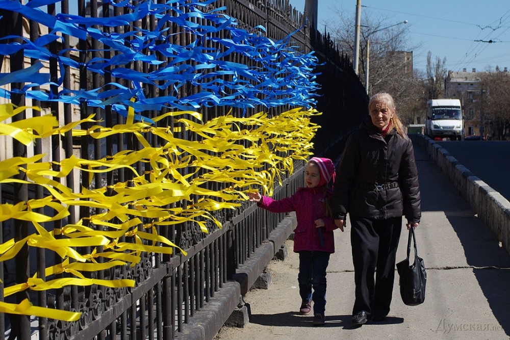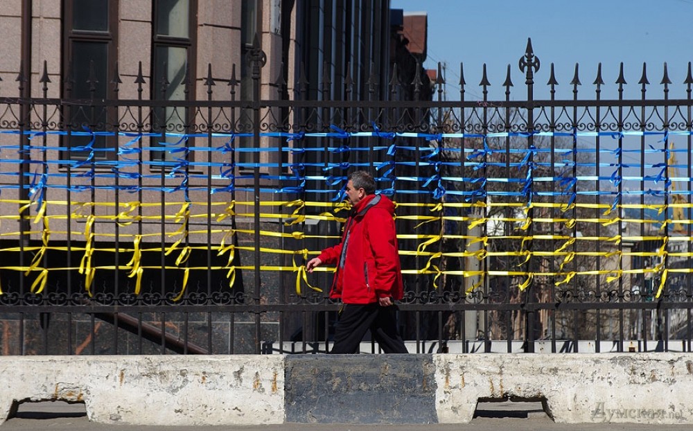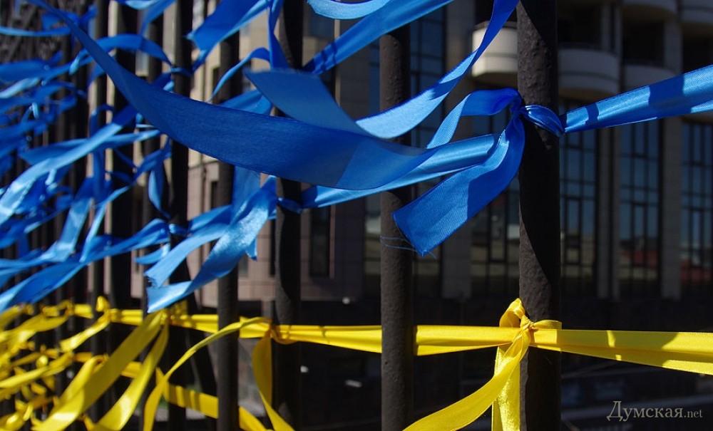 Аналогичные акции проводятся и в других городах. В Одессе «евромайдановцы» заплели жёлтыми и голубыми лентами Строгановский мост.